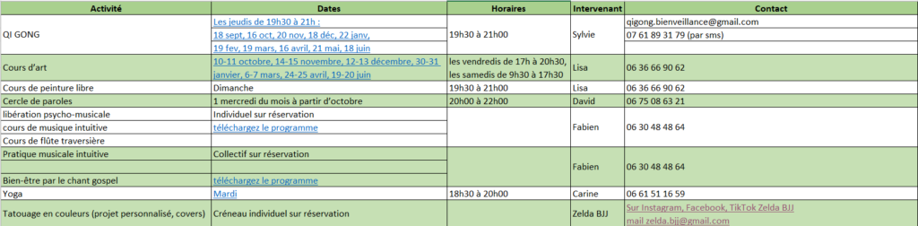 Des spécialistes indépendants vous proposent diverses activités pour favoriser votre épanouissement et votre bien-être, à travers l’art, l’énergie et l’accompagnement personnalisé :